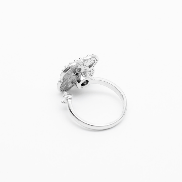 A sculpted floral swirl of pavé brilliance atop a sleek silver band—romantic, radiant, and artfully modern.