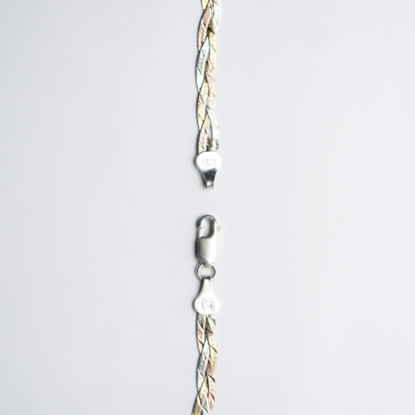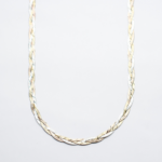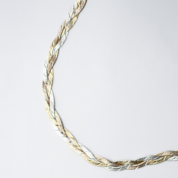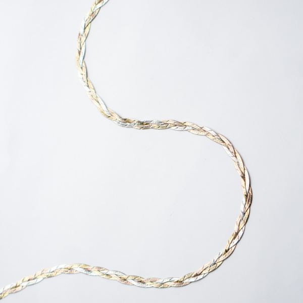A dual toned braided chain featuring a mix-metal vibe with two gold plated chains braided neatly with a strand of silver, perfect to make a statement with a simple outfit!