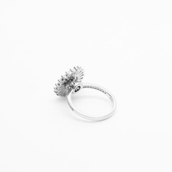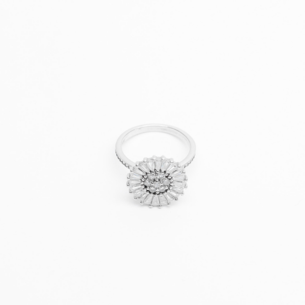 A radiant sunburst-inspired ring crafted in polished silver, featuring a brilliant centre surrounded by shimmering accents. Bold yet elegant, designed to shine beautifully with every movement.