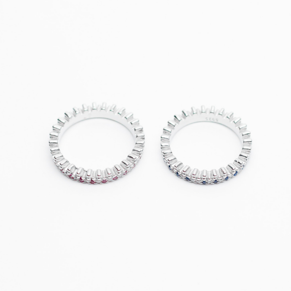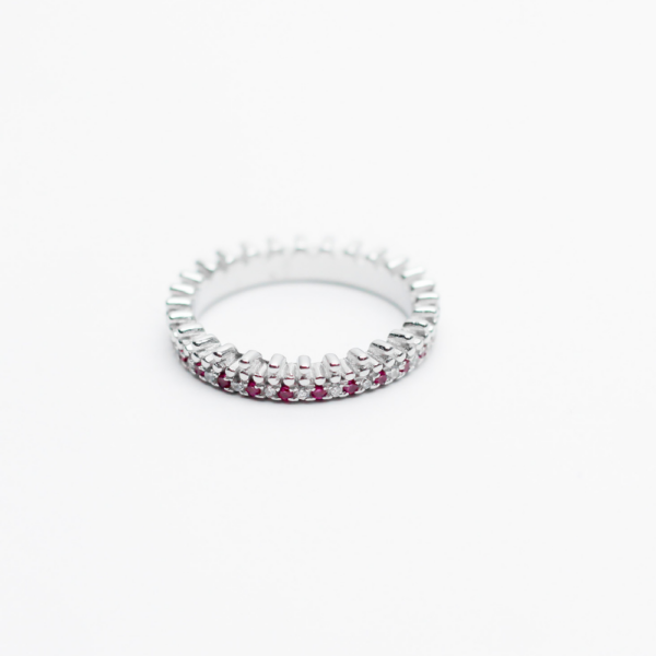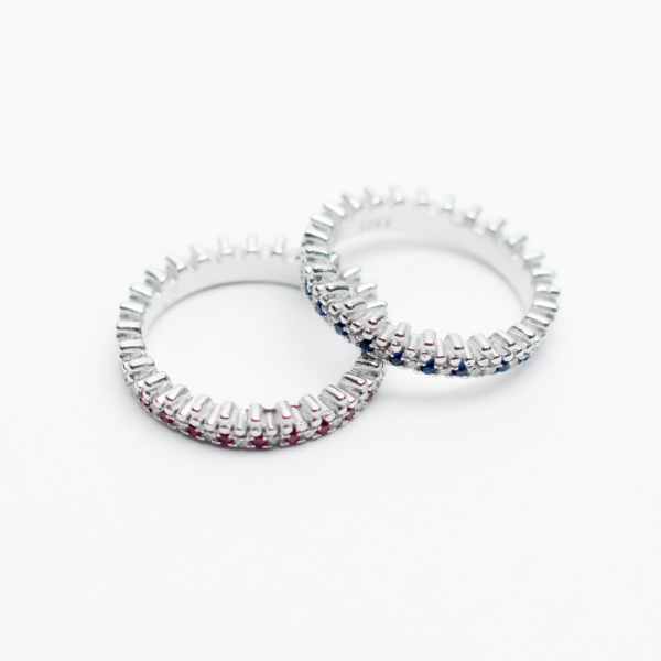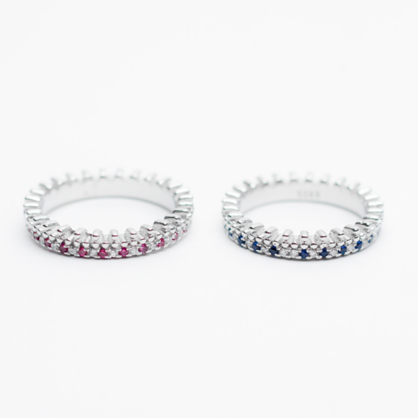 Adorned with ruby and sapphire-toned stones, the deedee band ring features slim bands bringing a subtle, quiet, luxurious essence to your everyday ensemble.