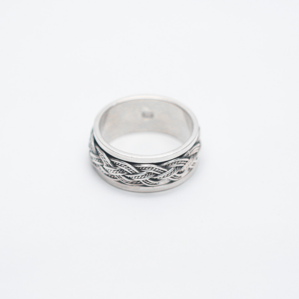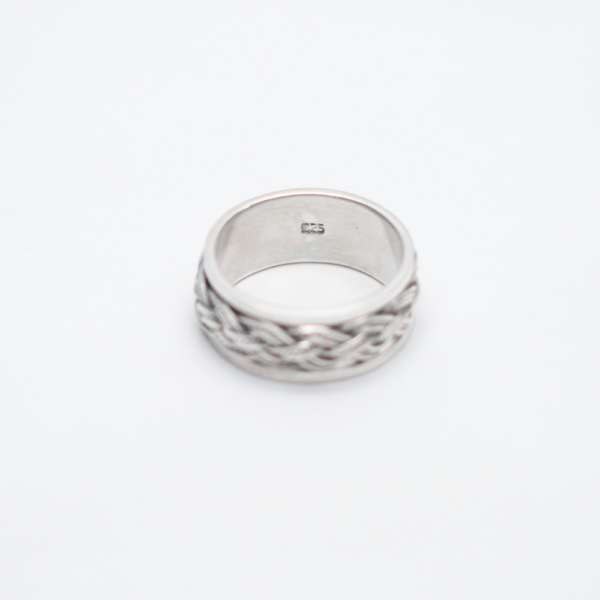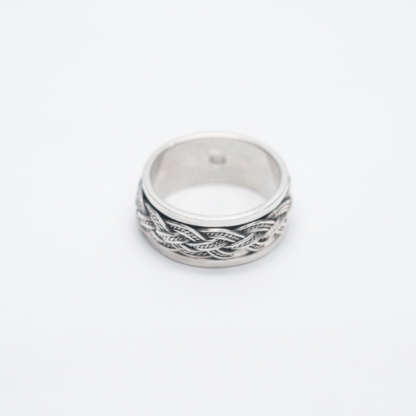 The emer spin ring features a braided oxidised pattern on a polished silver band – perfect companion for your everyday stack.