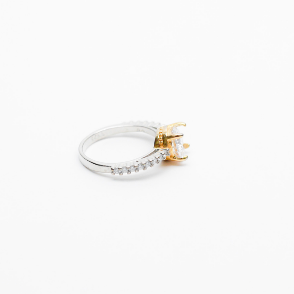 Crowned with a warm gold-plated base, the gene diamond ring features a luxurious silver band with intricately set diamonds in a pavé setting.