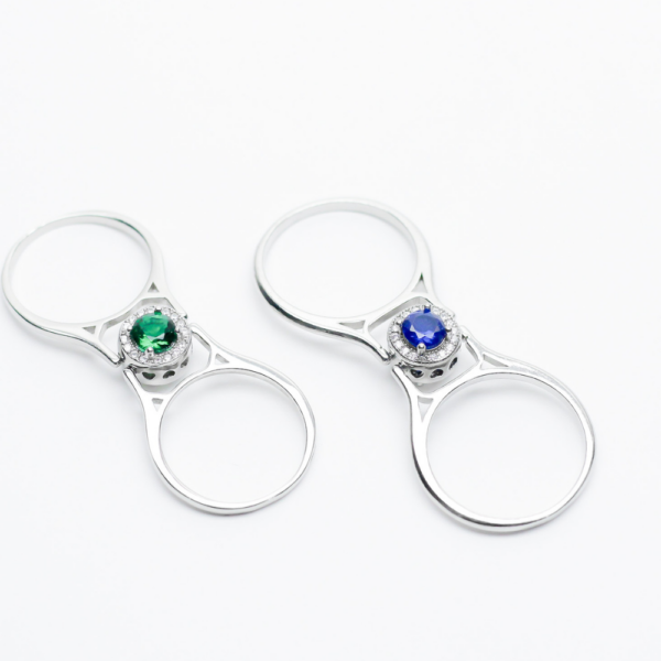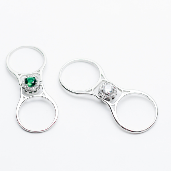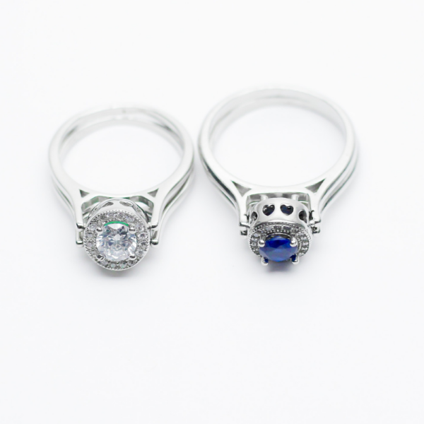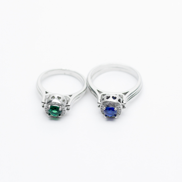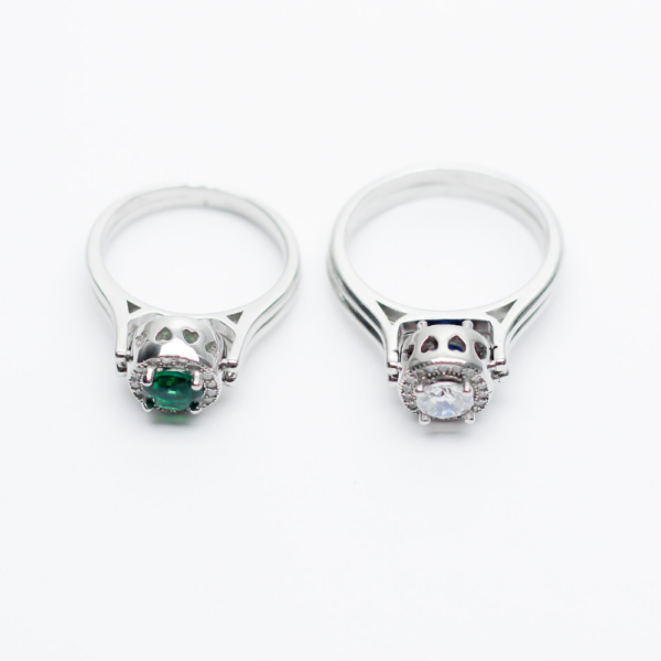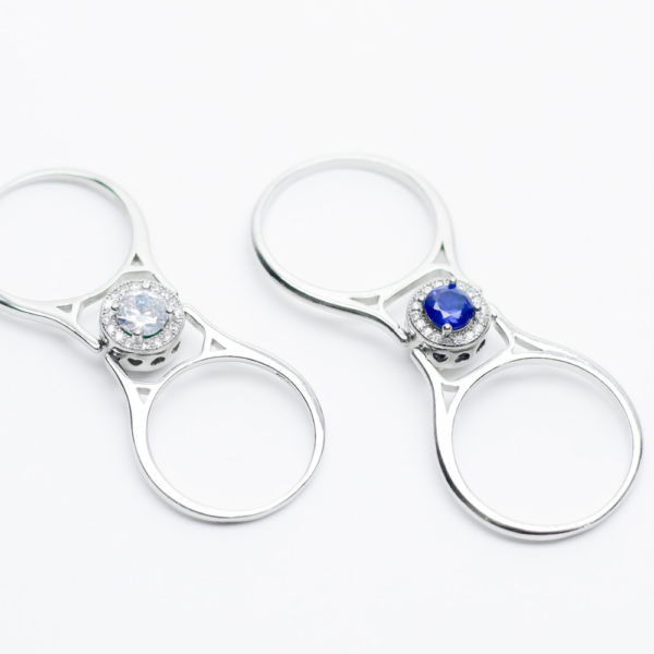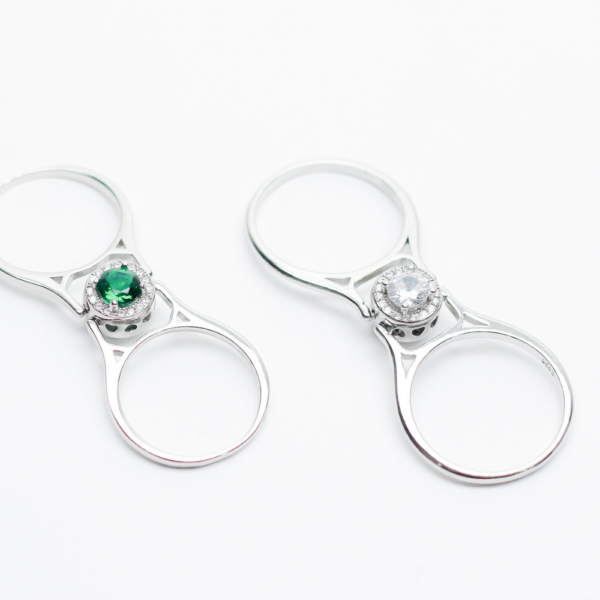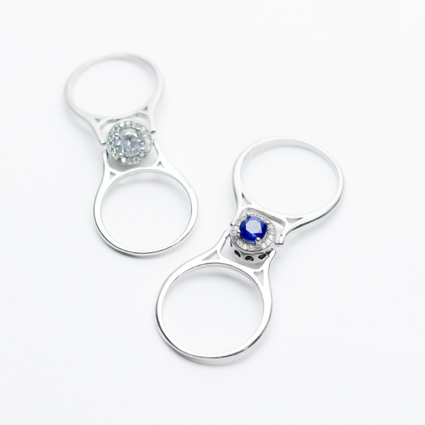 Silver bands with heart cut shoulders and a halo-set stone in the centre – the milly ring with its flip design is A sculpted floral swirl of pavé brilliance atop a sleek silver band—romantic, radiant, and artfully modern. fun, romantic, yet strikingly elegant!