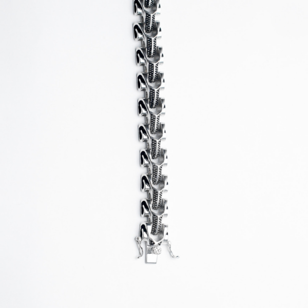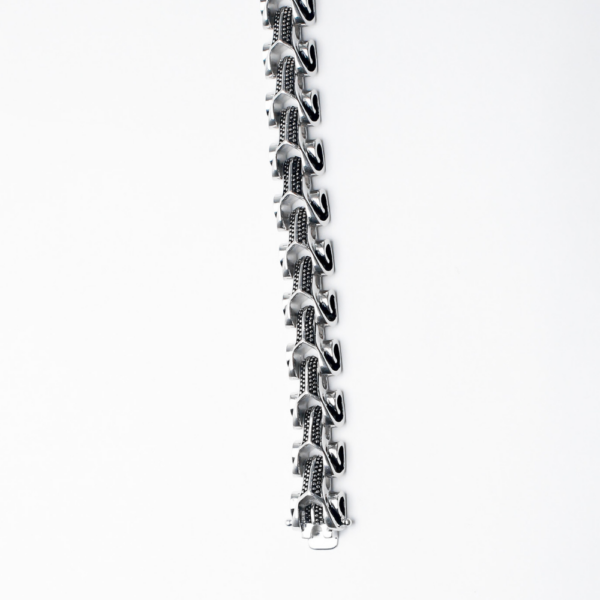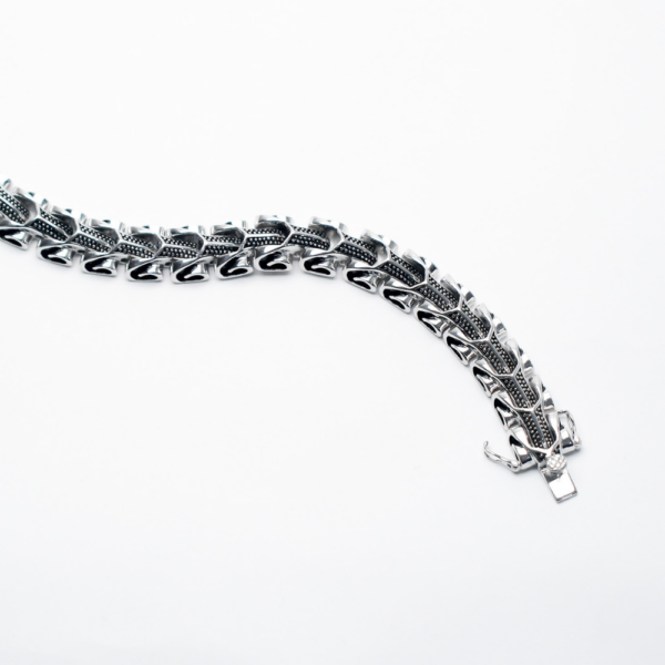 Featuring a deep oxidised texture with a bold arrow-link detailing, the olle bracelet is designed for those who seek a striking look with the timelessness of 925 sterling silver.