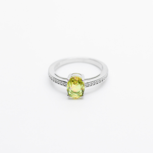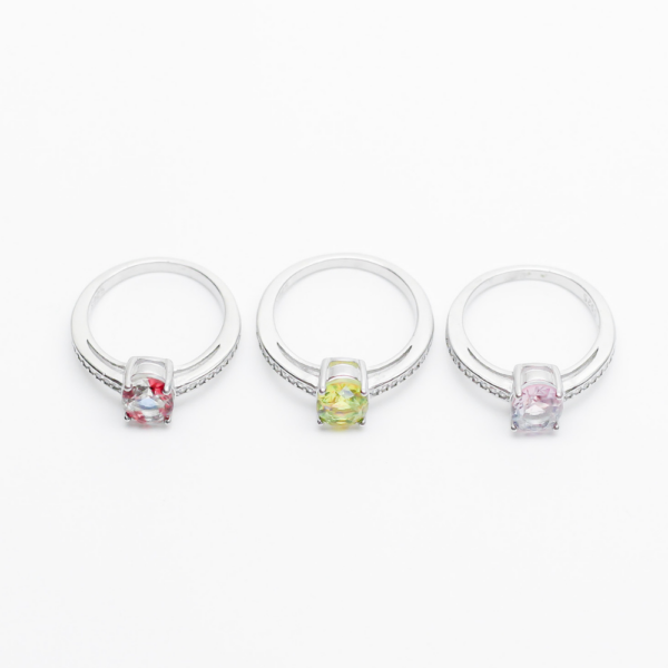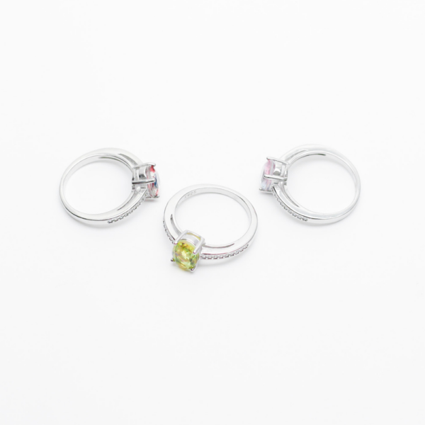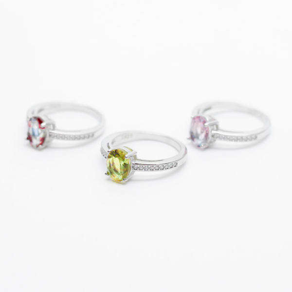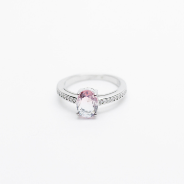 A refined silver ring featuring a soft blush-toned oval stone accented with delicate side sparkle. Timeless and graceful, this design adds a subtle pop of colour and elegance to any occasion.