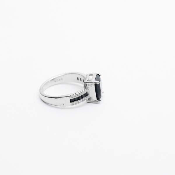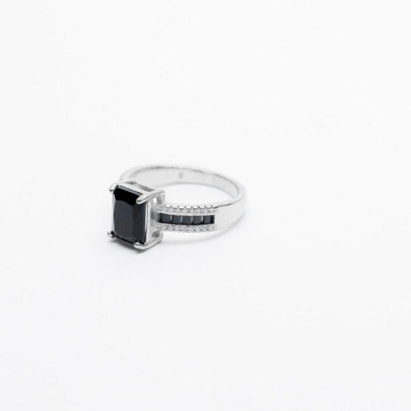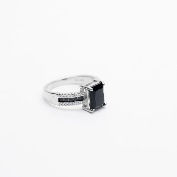 A bold silver-tone ring featuring a sleek rectangular black stone centrepiece, accented with subtle crystal detailing along the band. Modern and striking, this design is perfect for a confident, statement-making look.